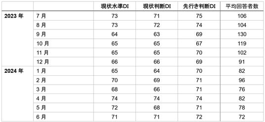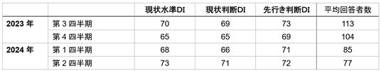 ・先行き判断DIは、前四半期差で+1ポイントの72と横ばいであった。