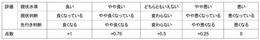 - 調査客体から収集した判断内容を下表のとおり点数化し、その平均値を最低0点から最大100点となる指数(Diffusion Index、DI)として示しています。そのため、この指数では50より大きいほど「購買意欲が強い」、小さいほど「購買意欲が弱い」と判断されていることになります。