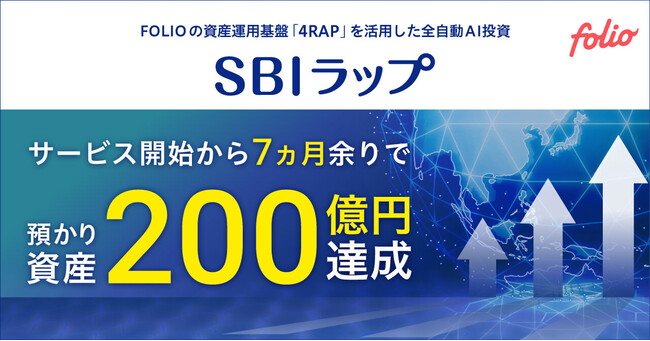 株式会社FOLIO(本社:東京都千代田区、代表取締役CEO:甲斐真一郎、以下:FOLIO)は、株式会社SBI証券(本社:東京都港区、代表取締役社長:高村正人、以下:SBI証券)のお客様向けに2022年3月31日より提供を開始した「SBIラップ」に関して、サービス開始7か月余りで預かり資産200億円を達成しましたので、お知らせいたします。
