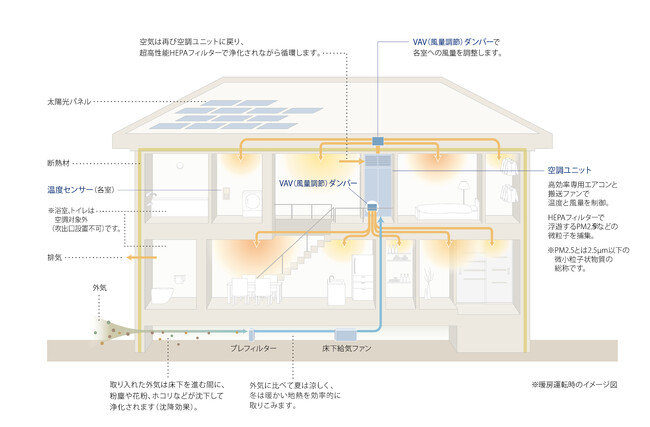 『エアロハス』は、専用エアコン1台で、居室だけでなく廊下や洗面室等の非居室空間も換気・空調。四季を通じて、家の中を快適な温度にし、心地よく過ごせます。また、専用エアコンが入る空調ユニットから宅内へ搬送する空気は、0.3㎛の微小粒子を99.97%捕集できる※1高性能な「H E P Aフィルター」でしっかり浄化。ホコリや花粉はもちろんPM2.5※2にも対応し、安心の空気環境を保ちます。