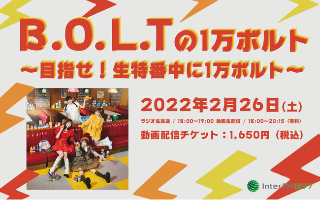 この度、InterFM897(TOKYO:89.7MHz)は、2022年2月26日(土)18:00から「B.O.L.Tの1万ボルト~目指せ!生特番中に1万ボルト~」を特別番組として生放送&生配信することが決定しました。