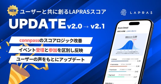 LAPRAS株式会社(所在地:東京都渋谷区、代表取締役:染谷健太郎 以下、LAPRAS社)は、ITエンジニアのスキルを可視化する「LAPRASスコア」をアップデートし、バージョン2.1をリリースしました。LAPRASスコアは、バージョン2.0より「ユーザーとともに作るスコア」へと進化しており、今回、ユーザーの声を受けてバージョン2.0以降初めてのバージョンアップを実施しました。本アップデートでは、主にTech Eventスコアの算出ロジックを改善しました。
