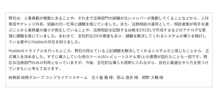 ・配属当初は法務知識が少ないことから、法務人材育成のため、簡易的にナレッジが共有できるシステムや、知識の均一化に資するシステムが必要だった