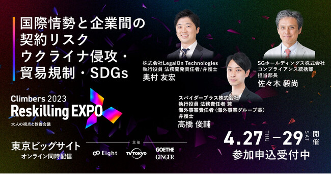トークセッションでは、LegalOn Technologies 執行役員法務開発責任者/弁護士 奥村友宏氏と、SGホールディングス株式会社コンプライアンス統括部担当部長 佐々木毅尚氏と共に、「国際情勢と企業間の契約リスク ウクライナ侵攻・貿易規制・SDGs」というテーマのもと、海外進出を検討中のスタートアップ企業にとって必須のリーガルリスクマネジメント、経営と法務のあり方、法務DX等のトピックも交えて、ビジネスおよび法務実務の両観点からお話しいたします。