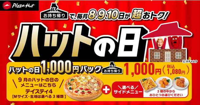 “ハット”にちなんで毎月8・9・10日は「ハットの日」!今月はMサイズの「テイスティ4」+サイドメニューの1品(3品の中から1つ選べる)パックをお持ち帰り限定で1,080円という超おトク価格で提供します。