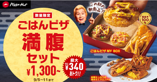 国産米100%のライス生地を使用した、表面はこんがり・中はふっくらとしたライス生地に濃厚なチーズと具材の味が絡み合う「ごはんピザ」と、「ハットフライポテト」、「ナゲット2個」がセットになった「ごはんピザMY BOX」をご注文で「和栗たっぷりの焼きたてマロンパイ」が、最大340円おトクになって付いてくる「ごはんピザ満腹セット」をお届けします。