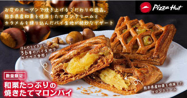 ピザハットの「和栗たっぷりの焼きたてマロンパイ」は、熊本県産和栗を使用したたっぷりのマロンクリームをこだわりのパイ生地に包んで焼き上げたこだわりのデザートです。カラメルを練り混んだ36層のパイ生地をご注文の直後にお店のオーブンで焼き上げることで、ほんのりビターな味わいとサクサクの食感が楽しめます。