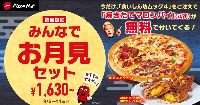 食いしん坊のムックがオススメする「あぶり炭火牛カルビ」と「BBQマヨタツタチキン」、「ほっくりポテマヨソーセージ」と「プレミアム・マルゲリータ」が一緒になった、食欲の秋にピッタリの「食いしん坊ムック4」をご注文で、熊本県産和栗を使用したマロンクリームをサクサクなパイ生地で包んだデザート「和栗たっぷりの焼きたてマロンパイ」が無料で付いてくるこの秋限定の「みんなでお月見セット」をお楽しみください。