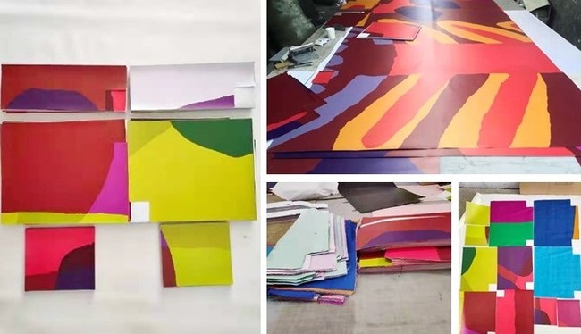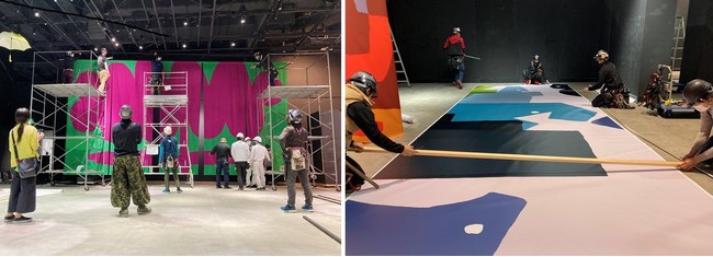 このバッグは、2021年4月に東京ドームシティ内、Gallery AaMoで開催予定だった展覧会「鈴木マサルのテキスタイル―色と柄をすべての人にー」で展示使用した壁面装飾用ターポリンとタペストリー生地をアップサイクルして作られています。この展覧会は膨大な熱量をかけて準備されましたが、3日間にわたる設営作業が終了した開催前日に新型コロナウィルス感染に伴う緊急事態宣言の発令とイベント等の休業要請を受けて開催中止となり、一般には公開されることなく「幻の展覧会」となってしまいました。