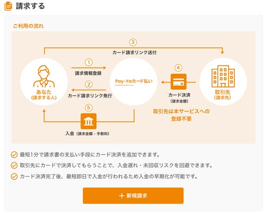 また、請求書の発行者(請求者)に関しては、本サービスを利用することで、顧客へ商品・サービスなどの対価を請求する際の支払方法にカード決済の選択肢を追加できるようになります。本サービスを利用した場合、支払者がカード決済後、最短即日以内に指定口座へ請求金額の入金が行われます。これにより、請求者は支払遅延・未回収リスクの軽減やキャッシュフロー(資金繰り)の改善が図れます。加えて、請求先への与信はカード会社が行うため、請求先の与信が行えないことを理由に新規取引ができないといった機会損失の防止にも活用できます。