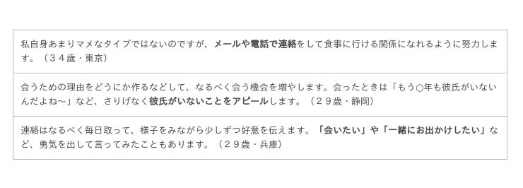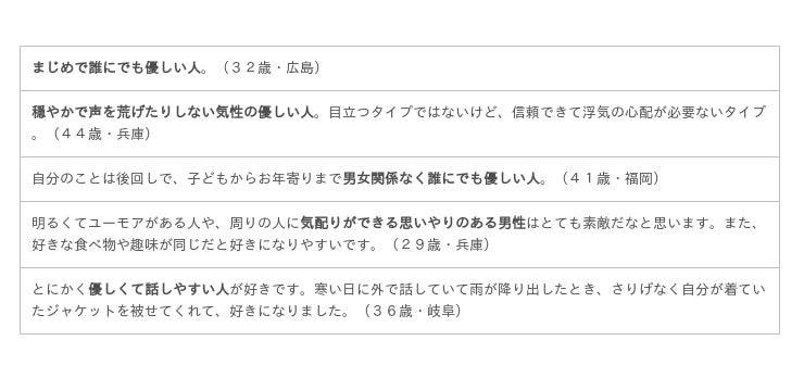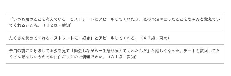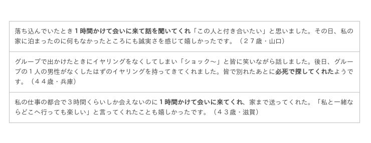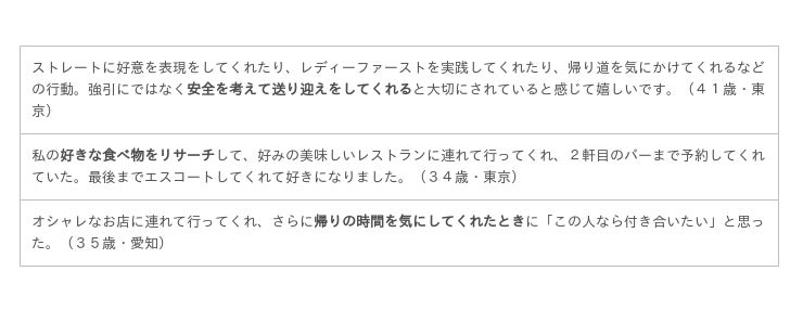 さまざまなエピソードがありましたが、すべてに通じるのは「自分を大切に思ってくれる」「誠実に対応してくれる」という男性の自分に対する愛情を感じたときに、その男性との交際を意識するところがあるようです。