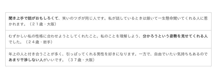あとは話が面白く楽しませてくれる男性や、こちらの話をよく聞いてくれるといったコミュニケーション能力の高い男性に惹かれるAB型女子が多いことも分かりました。一方で、「あまり干渉されたくない」という意見も多々挙げられていました。