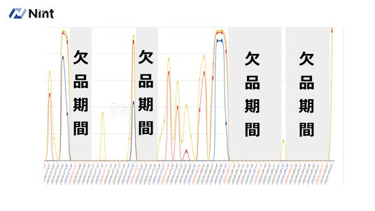 参照:特定商品の売上ランキング推移(Nint ECommerce 商品分析より参照)※灰色部分が欠品期間