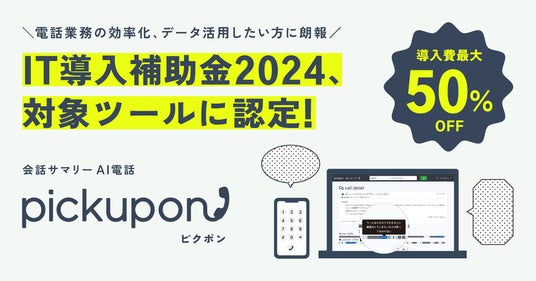 pickupon株式会社(読み:ピクポン、本社:千葉県市川市、代表取締役:小幡洋一 以下、pickupon)は、経済産業省 中小企業庁が監督する「IT導入補助金2024」において、「IT導入支援事業者」に採択されました。同採択に伴い、会話サマリーAI電話「pickupon(ピクポン)」も補助金対象のITツールとして認定されました。補助対象となる中小企業・小規模事業者は、新たにpickuponを導入する際にかかる費用の1/2以内を補助金として受けとることが可能になります。