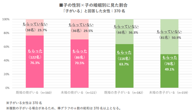 は49.1%と、娘息子のいずれも既婚の子がいる人の方が、母の日に何かをしてもらっている割合が高かった。