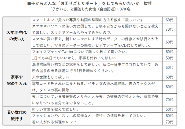 ・また、「子から「お困りごと」をサポートしてもらえるとしたら何をお願いしたいか」と尋ねると、「スマホの使い方」「自由な時間」「家の手入れ」などの意見が目立った。