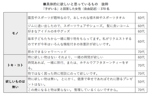・欲しいものの自由記述では、「スポーツウェア」「アイドルのグッズ」など趣味のものや「体重計」「シャワーヘッド」などの生活用品が多く挙った一方で、「一緒の時間」「相談にのって欲しい」など、モノ以外のリクエストも多かった。