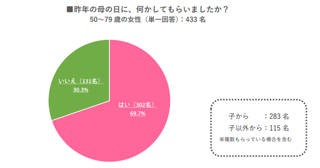 ⇒全体の69.7%が、母の日に何かをしてもらっている。娘がいる人(256人)のうち、母の日に何かしてもらった人は75.8%。一方、息子がいる人(296人)の場合は61.5%。娘がいる場合の方が14.3ポイント高かった。