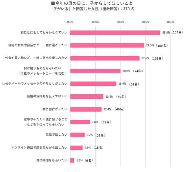 ・母の日にしてほしいことを尋ねたところ、「特になにもしてもらわなくてもいい」が最多で35.9%、続いて「自宅で食事など、一緒に過ごしたい」が29.5%。「一緒に外出を楽しみたい」が27.6%と、一緒にできることを望む声が多い結果となった。