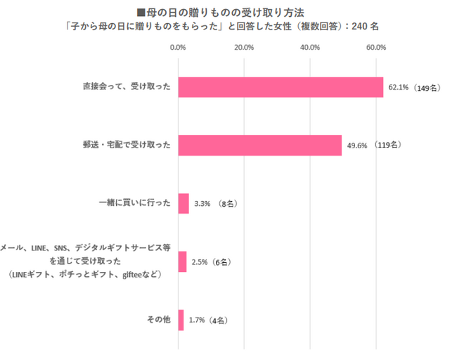 GIVEとTAKE両方の喜びを享受する50~70代女性は、「母の日」は家族の中心(主役)であり、コミュニケーションの要です。そんな主人公(当該女性)は、コミュニケーション手段さえも使い分けていました。親世代とは「直接会う」、子世代とは「LINEやメール」が最多でした。なんて器用なのでしょう。子世代からの受け取り方法には、「LINEギフト」など新たなあり方も垣間みられました。まだ2.5%ではありますが、新たな母の日ギフトの兆しではないでしょうか。ますます、非接触コミュニケーションやギフトの受け渡し方法に関しては、進化していくことが予測されます。新しい手段も取り入れたり、しなやかに使い分けたりしながら、「母の日」を思う存分享受する、そんな一日にしたらよいのではないでしょうか。