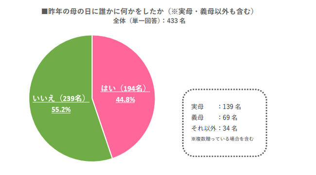 ・昨年の母の日に、誰かに何かをしたという人は全体の44.8%だった。