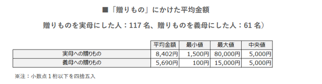 母の日の贈りものにかけた平均金額は、実母が8,402円、義母が5,690円。
