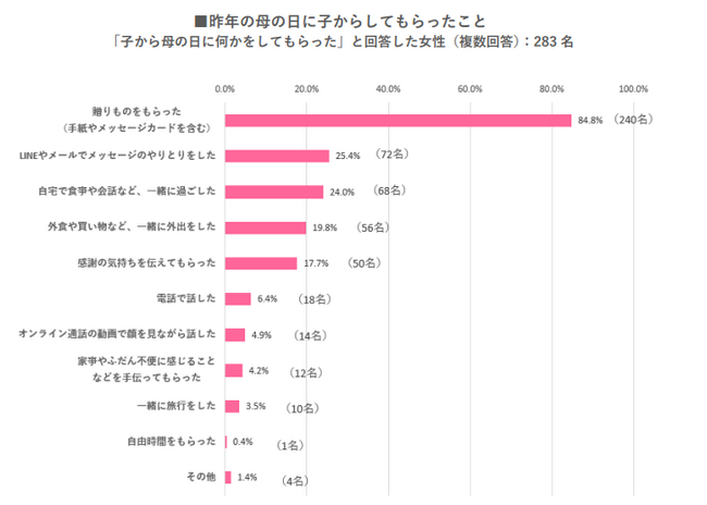 ・昨年の母の日に子からしてもらったことは、「贈りもの」がダントツ首位で全体の84.8%。その他、「LINE