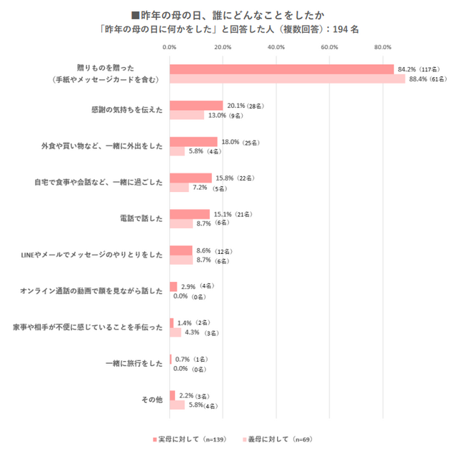・実母には「贈りもの」だけでなく「感謝の気持ちを伝えた」「一緒に外食をした」「一緒に過ごした」「電話で