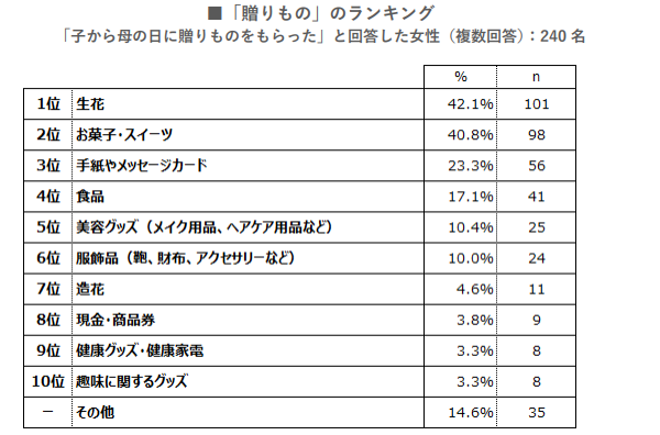 ・贈りものの内容は、1位「生花」(42.1%)、2位「お菓子・スイーツ」(40.8%)3位「手紙・メッセージカード」(23.3%)だった。