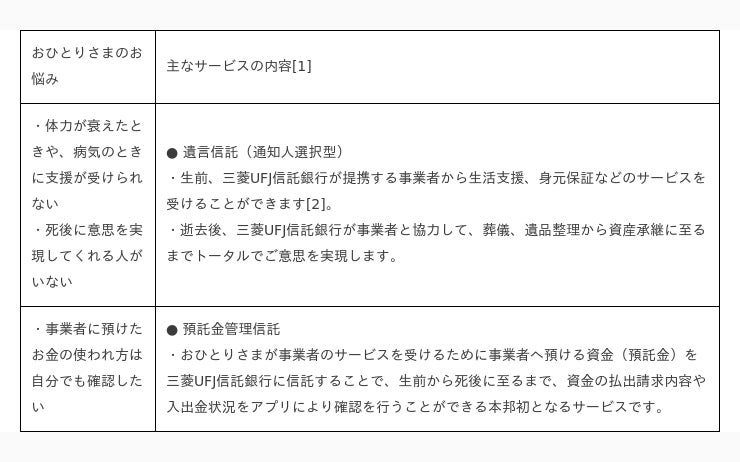 株式会社三菱UFJフィナンシャル・グループ(代表執行役社長 亀澤(かめざわ) 宏(ひろ)規(のり)、以下 MUFG)および連結子会社である三菱UFJ信託銀行株式会社(取締役社長 長島(ながしま) 巌(いわお)、以下 三菱UFJ信託銀行)は、身近に頼れる方がいない高齢者(以下 おひとりさま)の生前から死後にわたる安心を提供する「おひとりさまライフサービス」(以下 本サービス)の取扱いを本日より開始します。