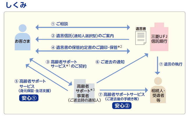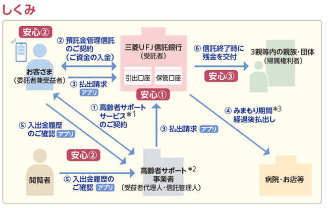 この度、三菱UFJ信託銀行は、生活支援、身元保証、死後事務などのサービスを提供する「高齢者サポート事業者」(以下 事業者)と提携し、事業者が提供するサービスと三菱UFJ信託銀行が提供する「信託」を活用した金銭の管理、財産の承継などのサービスを一体で提供する「おひとりさまライフサービス」の取扱いを開始します。なお、本サービスは、三菱UFJ信託銀行の信託代理店である三菱UFJ銀行においても取扱いを開始いたします。