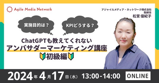 『世界中の“好き”を加速する』をビジョンに掲げ、ブランドのファン育成・活性化を手がけるアジャイルメディア・ネットワーク株式会社(本社:東京都港区、代表取締役社長:宮地 広志、東証グロース上場:証券コード6573、以下AMN)は、『実施目的は?KPIどうする?ChatGPTも教えてくれないアンバサダーマーケティング講座 初級編』と題し、アンバサダーマーケティングを成功に導くノウハウについてお伝えするオンラインセミナーを開催いたします。