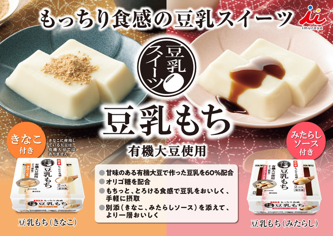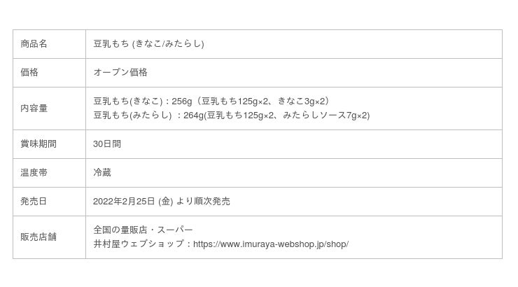 井村屋株式会社(本社:三重県津市高茶屋七丁目1番1号、社長:岩本 康)は、チルドの新商品として「豆乳もち(きなこ/みたらし)」を2022年2月25日 (金) より全国にて発売いたします。