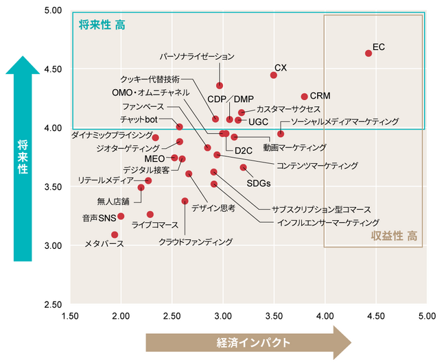 マーケティング、テクノロジー、消費の3分野は変化が激しく、様々なバズワードが飛び交います。この中から、中長期的に注目すべきトレンド(潮流)の見極めを目的とし、日経クロストレンドの活動に助言する外部アドバイザリーボード約50人と、編集部の記者など各分野の専門家の知見を集約しました。その分析結果は、「現時点での経済インパクト」と「将来性」の2つのスコアでマッピングしています。