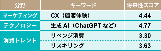 今回の調査で新たに追加したキーワードは、マーケティング分野の「CX(顧客体験)」と、テクノロジー分野の「生成AI(ChatGPTなど)」、消費トレンド分野の「リベンジ消費」「リスキリング」の4つです。