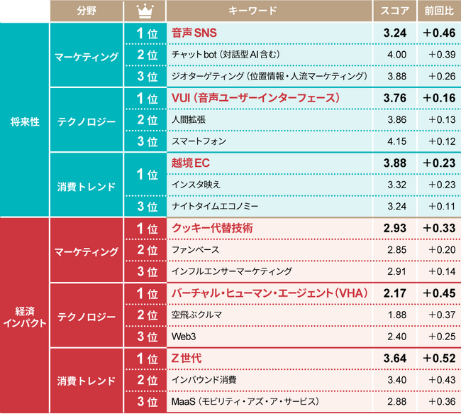 22年10月に実施した前回調査と比較し、今回、将来性スコアが伸びたトップ3は、マーケティング分野では「音声SNS」「チャットbot(対話型AI含む)」「ジオターゲティング(位置情報・人流マーケティング)」でした。また、テクノロジー分野では「VUI(音声ユーザーインターフェース)」「人間拡張」「スマートフォン」、消費トレンド分野では「越境EC」「インスタ映え」「ナイトタイムエコノミー」でした。
