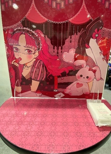 全体の色味をピンクに統一し、ハートやぬいぐるみなど可愛らしさを詰め込みました。女の子のイラストがパネルの半分以上になるよう大きく配置し、目立つようにデザインしました。奥行きが出るようにハートの風船を描き、背景にはチョコが解けたような装飾をのせることで、今回のテーマである“バレンタインらしさ”が出るように制作しています。背景の幕や女の子の衣装の柄やフリルなど、細部にもこだわりを入れたので是非隅々までご覧ください。