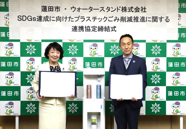 浄水型ウォーターサーバーのレンタル事業を行うウォータースタンド株式会社(本社:埼玉県さいたま市、代表取締役社長:本多 均、以下当社)は、2023年1月12日(木)に埼玉県蓮田市(市長:山口 京子)と「SDGs達成に向けたプラスチックごみ削減推進に関する連携協定」を締結したことをお知らせいたします。