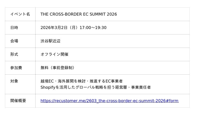 Recustomer株式会社(本社:東京都中央区、代表者:代表取締役 柴田 康弘、辻野 翔大、以下:Recustomer)は、越境ECおよびグローバル展開をテーマとしたイベント「THE CROSS-BORDER EC SUMMIT 2026」を、2026年3月2日(月)17:00~渋谷駅近辺の会場にてオフライン開催いたします。