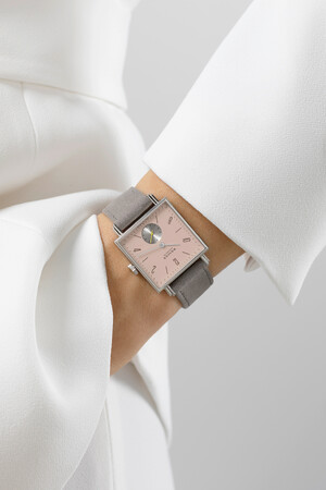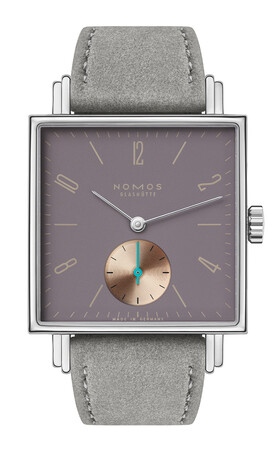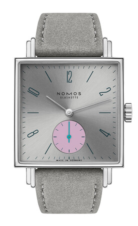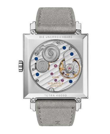 ストラップにはノモス社初のアルカンターラ社製ヴィーガンベロアストラップを使用。カーボンフリー素材ながら外観と触感は天然スエードに近く、さわやかな着け心地で通気性も良く、耐久性にも優れています。優しいベルベットグレイのヘリ返しストラップがこの美しく奏でるテトラを装います。