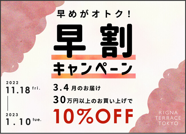 家具・インテリアショップの運営、ドラマの美術協力など手掛けるリグナ株式会社(本社:東京都新宿区、以下 リグナ)は、混み合うお引越しシーズン中に家具を揃えたいというニーズにお応えするため、2022 年11月18日(金)よりショールーム「リグナテラス東京」にて「早割キャンペーン」を実施します。
