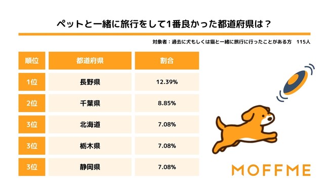 今までにペットと一緒に旅行に行ったことがあると回答した方に、今まで行った場所で1番良かった都道府県をお伺いした所、12.39%の方が「長野県」と回答し、第1位となりました。