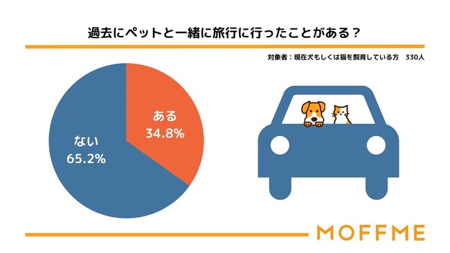 今回のアンケート回答者330人の34.8%がペットと過去に旅行に行ったことがあると回答し、