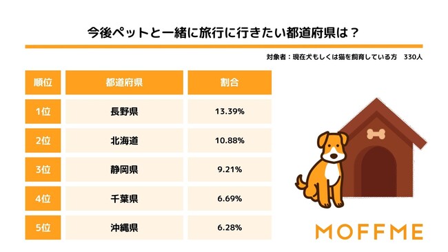 過去にペットと一緒に旅行に行ったことがないと回答した方も含め、今後ペットと一緒に旅行に行きたい都道府県を調査した所、こちらも第1位は「長野県」という結果になりました。