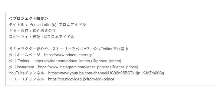 松竹株式会社が展開する文通もできる二次元アイドルプロジェクト『Prince Letter(s)! フロムアイドル』(通称プリエル)。