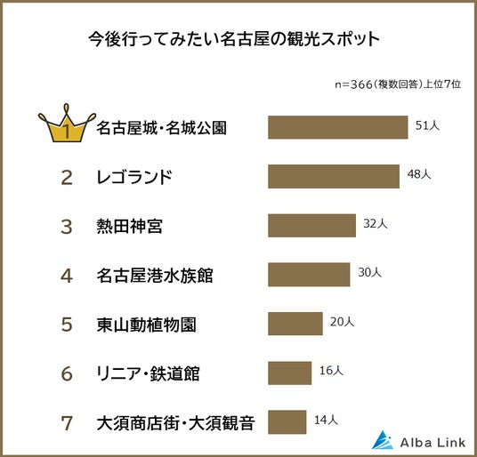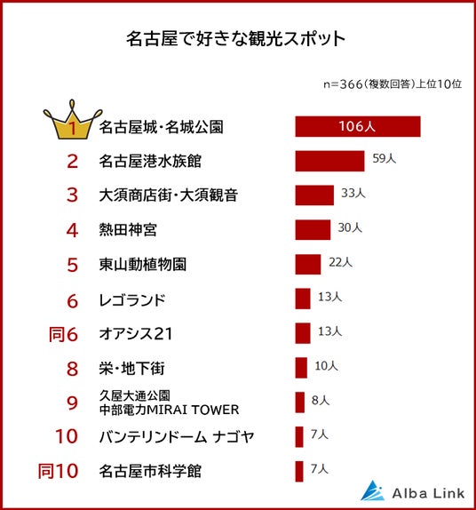 株式会社AlbaLink(本社:東京都江東区、代表取締役:河田 憲二)は、全国の男女366人を対象に「名古屋の観光スポットに関する意識調査」を実施し、そのデータをランキングにしました。