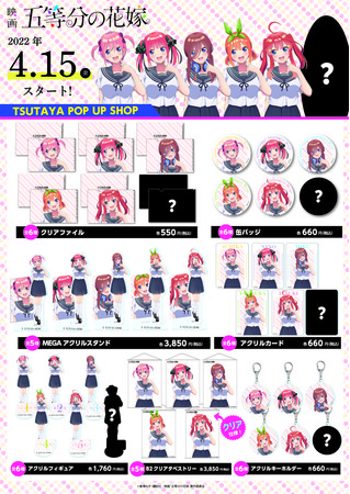 カルチュア・エンタテインメント株式会社(本社:東京都品川区 代表取締役社長:中西 一雄)は4月15日(金)より、全国のTSUTAYAにて開催の、週刊少年マガジンに連載された『五等分の花嫁』(著者:春場ねぎ)を原作とする「五等分の花嫁」のPOP UP SHOP『五つ子ちゃん、全員タマコ演じます!』にて、新規描き下ろしイラストを使用したグッズを販売いたします。