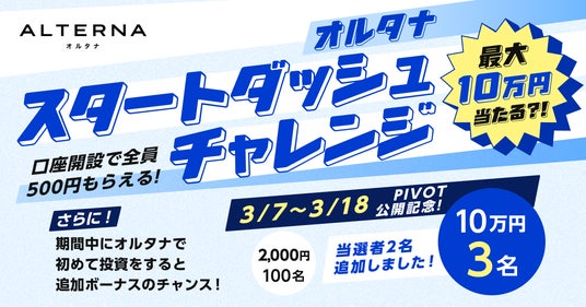 現在開催中の新規口座開設キャンペーン「オルタナ スタートダッシュチャレンジ」では、このたびのPIVOT動画公開を記念して、後半戦(2026年3月7日~3月18日)における10万円当選枠を1名から3名へ増枠いたしました。