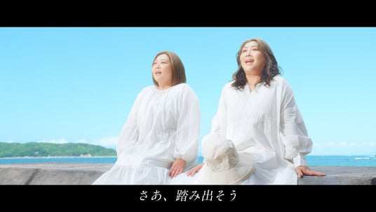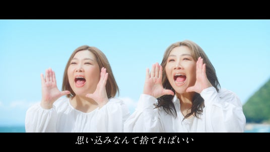 舞台は青い海と広がる浜辺。やすよさんとともこさんが、広い海に向かって叫び、浜辺をチャーミングに走るなど、コミカルなやり取りを繰り広げています。