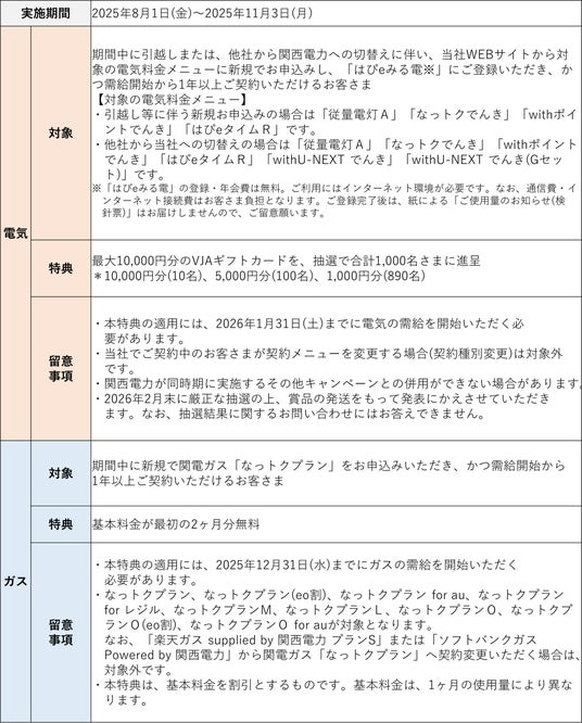 関西電力では、以下の電気とガスのキャンペーンを実施しています。